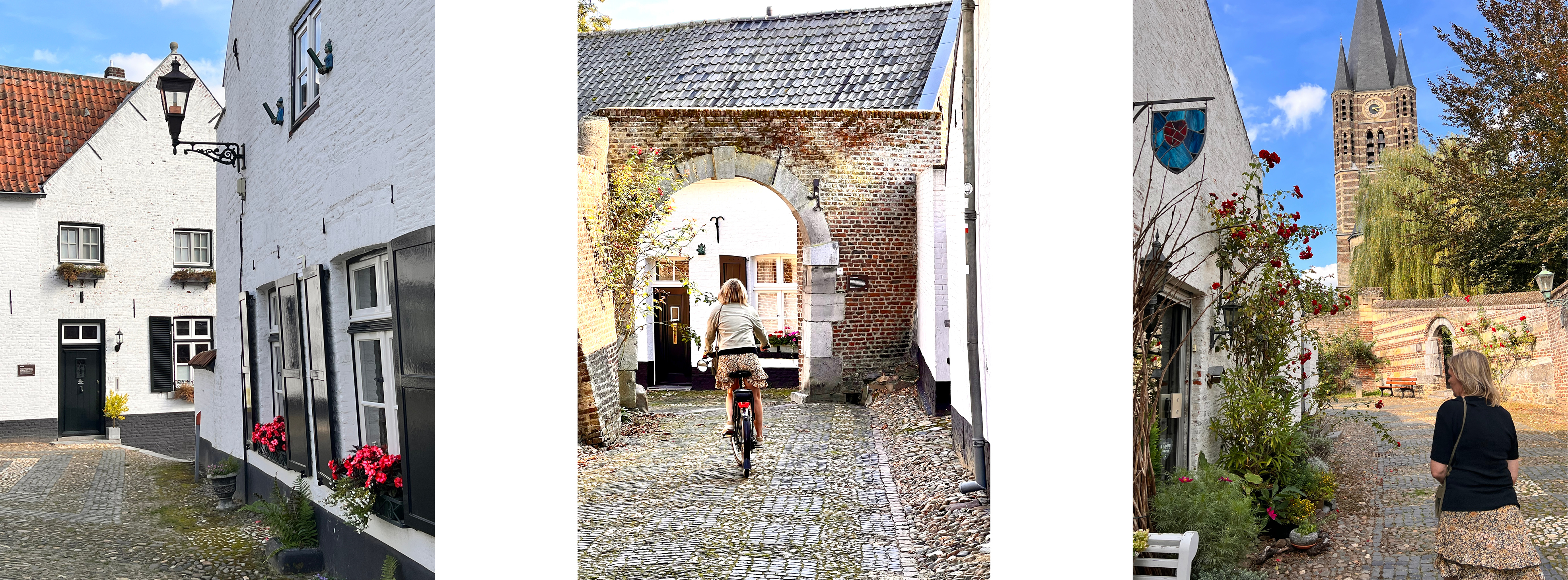 We fietsen naar ons overnachtingsadres in Parc Maasresidence Thorn, waar we een heerlijke kamer met uitzicht over een waterplas hebben. Als we ’s avonds bij Humprey’s Thorn op het terras een lekkere salade eten en daarna over een steiger wandelen, zien we in de verte het vrouwenstadje liggen.